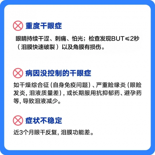温馨提示:术前一定要通过泪液分泌测试、泪膜破裂时间测定、眼表综合分析等检查,科学评估干眼状况。